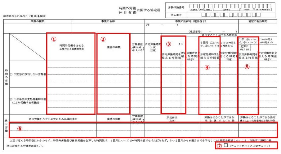 1日の法定労働時間は8時間ですから、それを何時間超える可能性があるか、協議の内容を記載します。